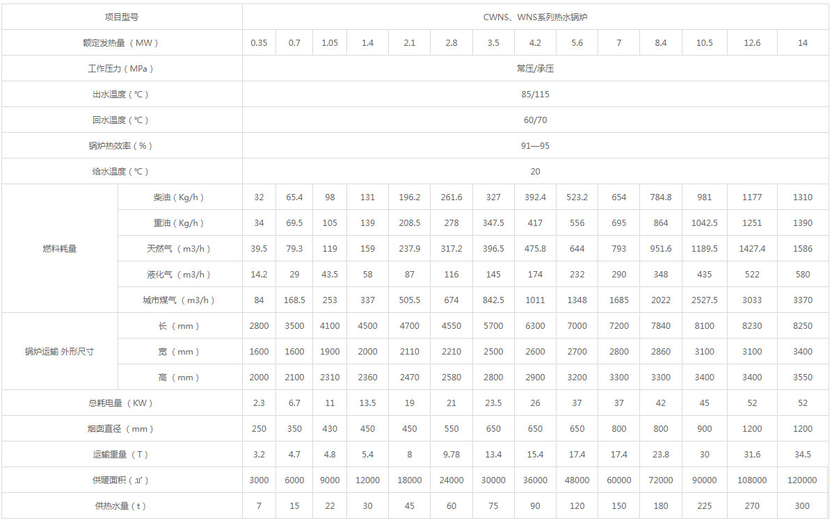 CWNS系列全自動燃油(氣)臥式熱水鍋爐(實用新型專利),采用臥式三回程濕背結構,改善鍋爐運行環境,提高鍋爐效率和使用壽命;全部煙氣通道置于水中,尾部配有余熱水箱及完善的保溫外包設計,煙箱密封采用迷宮式結構,避免了煙箱漏煙現象。鍋爐熱效率高達90%以上,采用有良好膨脹性能的波紋爐膽與錐形爐膽的組合爐膽,爐膽尺寸與火焰相吻合,煙氣流通面積以次減小,使煙氣等速流動,保證高溫煙氣在爐內的熱交換時間,達到最佳傳熱效果;采用與鍋爐完全匹配的高性能燃燒機,進行全面自動調節,使燃燒充分,節省燃料,降低污染;采用高保溫性能的超細玻璃棉,散熱損失更??;采用智能化節能控制系統,對鍋爐及供水、供暖、自控水溫系統進行控制,結合不同負荷調節燃料供給,更加節能。安裝方式為整體快裝鍋爐,振動小,對地基無特殊要求,不需地腳螺栓固定,安裝簡單易行。 采用活動爐頭結構,可匹配各種燃燒器,更換爐頭,維修爐體方便快捷。 前、后煙箱采用活動可拆結構,可方便地對鍋爐內部進行檢查、維護、保養,簡單、便捷,產品設計新穎、結構合理,工藝性能良好,使本產品具有不同凡響的優異品質,是最新開發的新款產品。